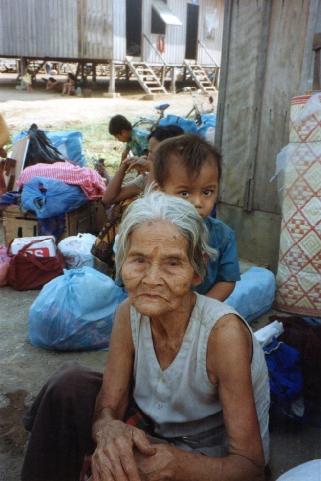 The first, and only main meal of the day will likely be at 11 am. A family with an able-bodied person: a father who can cross the border to Thailand to work as an exploited labourer; or a daughter who can work in the sweat shop factories in Phnom Penh have at best some precarious security. Many families, still with no electricity or running water, hope that their child will be educated and find work that brings in real money. For a mother alone with children to care for, there is little hope to hold. But they keep up appearances. They sweep the bare earth around their little hut-on-stilts lest a child step on a scorpion, they wash their sarong and the child-clothes and pin them out on a line. Neighbours walk to work, threading their way between these small dwellings. If fortunate they may carry, for example, bananas and batter on one shoulder pole and a terra cotta pot with glowing charcoal on the other. Such an asset should bring enough money for food for a day.